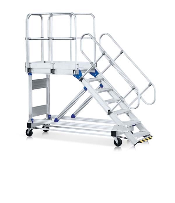 Алюминиевый трап с платформой Zarges Z600 передвижной 800мм 15 ступеней 45° 40259661 с эргономичным стопором Ergo Stop. Мобильность и комфорт: лестница с эргономичной функцией тормоза, а также платформа особо большого размера. Лестница-платформа, исключительно быстро приводимая в рабочую готовность благодаря новой системе тормозов ZARGES - теперь в числе стандартных изделий. ZARGES Ergo Stop - все четыре ролика тормозятся очень удобно с помощью педали у нижней ступеньки. Особо просторная платформа размерами 1 200 x 800 мм позволяет удобно работать даже двум человекам. Стойки из высокопрочных алюминиевых прессованных профилей с резьбовыми каналами для гибкого монтажа. Выбор необходимого наклона: 45° для удобного подъема или 60° для узких мест. Серийное покрытие ступеней - желобчатый алюминий. В качестве опции за дополнительную плату доступно также покрытие из стальной решетки. Это следует указать при заказе. Перильное ограждение: серийное оснащение с двусторонним поручнем и перилами площадки по периметру. Примечание: Соответствует DIN EN ISO 14 122.