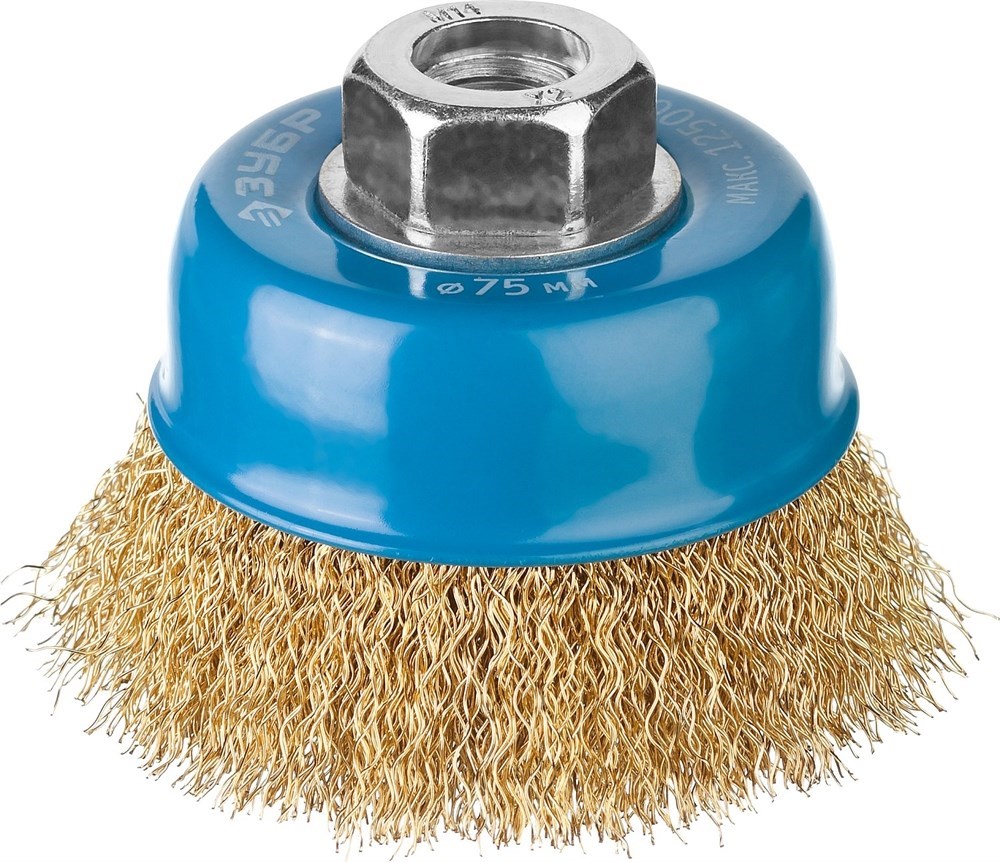 Чашечная щетка для УШМ Зубр Профессионал М14 x 75мм 3526-075_z02 подходит для щадящей обработки поверхности без повреждений благодаря витой проволоке. Латунированное покрытие защищает рабочую часть щетки от коррозии.