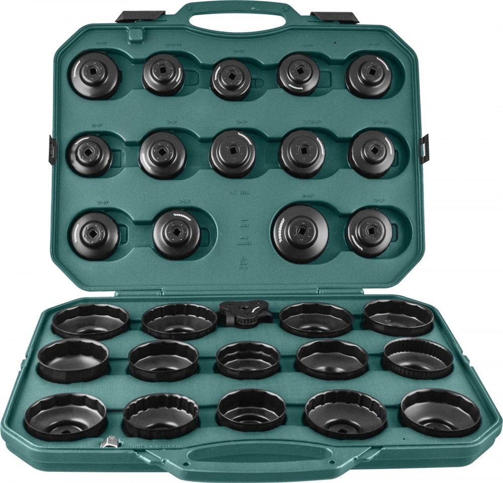 Комплект чашек для съема масляных фильтров 65-120 мм, 30 предметов Jonnesway AI050004A универсальный набор чашек, применяющихся для подавляющего большинства выпускаемых сегодня фильтров различных производителей. Все инструменты изготовлены из штампованной стали и снабжены присоединительным гнездом, позволяющим использовать штатные слесарные приводы с размером квадрата 3/8”DRили, в сочетании с входящим в комплект поставки адаптером, 1/2"DR.