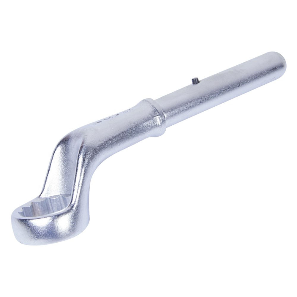 Назначение: Работа с крепежом конструкций и техникой промышленного масштаба. Область применения: Ремонт и обслуживание крупногабаритной техники и конструкций, промышленность, сельское хозяйство, производство, строительство, станции технического обслуживания автомобильной и другой техники. • Использовать ключ в тяжелых условиях под действием больших нагрузок. Особенности: • Для использования совместно с рычагом-трубой арт. 112261 • Накидной профиль прямого действия: работа в местах, где другие форматы ключей не подходят. • Специальный изгиб ключа позволяет работать в местах с ограниченным доступом к крепежу. • 12-тигранный профиль накидной части универсален в работе с головками болтов или гайками как 6- ти, так и 12-тигранного профиля. Качество: Ключи изготовлены из инструментальной легированной хром-ванадиевой стали специального сплава, состоящего из 15 элементов, входящих в его состав. Технология изготовления ключей включает в себя метод горячей ковки с последующей термообработкой,Характеристики