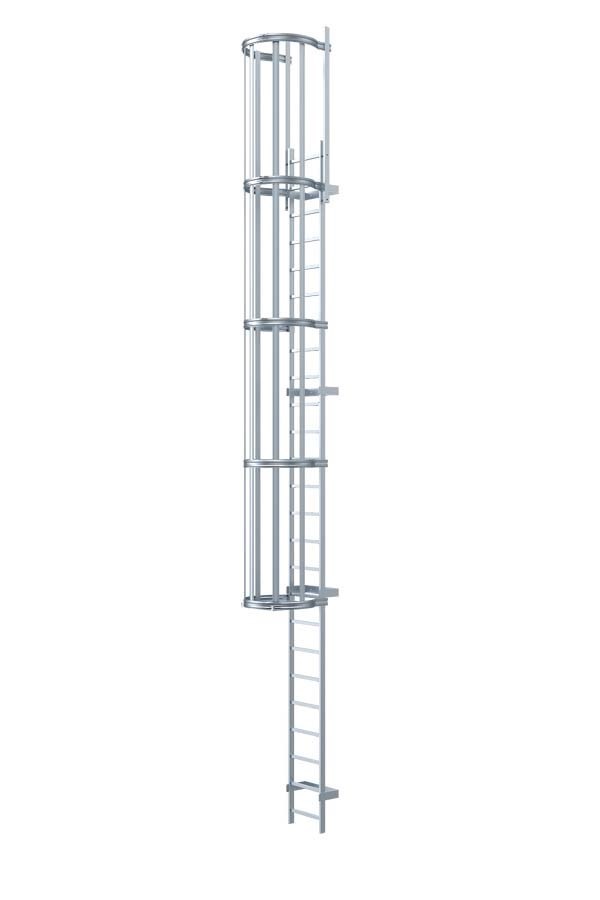 Наружная пожарная лестница Zarges Z600 нержавеющая сталь, 9,6м 58496 стационарный доступ к зданиям и машинам на высоте до 10 м. Может использоваться, и сертифицировано, как путь эвакуации. Для стационарного монтажа по месту в зданиях, либо для техобслуживания согласно стандарту DIN 18 799-1, либо в качестве системы эвакуационных лестниц согласно стандарту DIN 14 094-1, либо для доступа к машинам согласно стандарту DIN EN ISO 14 122-4. Решетка для защиты спины как средство безопасности, используется согласно любому стандарту. Рейка для защиты при подъеме согл. DIN EN 353-1, по стандартам DIN 18 799-1 и DIN EN ISO 14 122-4, также при высоте подъема свыше 10 м как одноходовая лестница для подъема. Ширина лестницы: 520 мм. Стенное крепление с различными расстояниями от стены, до 600 мм по выбору. Расстояние между настенными креплениями составляет не более 2,00 м. При этом для монтажа каждой лестничной секции используют не менее двух креплений. Шкафы для предохранителей, блокировка проходов, а также площадки можно выбирать по требованию. Нестандартные лестницы изготавливаются на заказ. Примечание: Дюбели и винты для крепления к стене в комплект поставки не входят. Приведенные ниже двухступенчатые цены на оборудование рассчитаны следующим образом: настенное крепление U-образной формы, 200 мм жесткие, с обеих сторон прямые тетивы на выходных участках, включая решетчатую защиту спины согласно\ DIN 18 799-1. Если ваши требования отличаются, просим воспользоваться нашей системой планирования стремянок.Таблица сравнения характеристик: