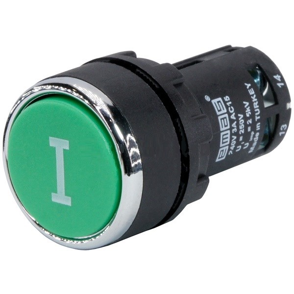Нажимная моноблочная кнопка EMAS 22 мм, IP 40 (1НО) зеленая с маркировкой "I" MB100DY1