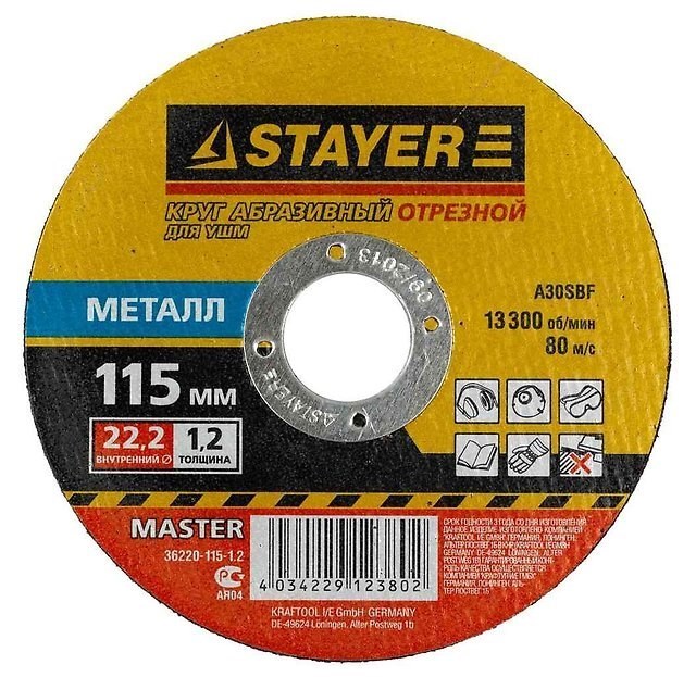 Отрезной круг Stayer "MASTER" абразивный, 125мм 36220-125-1.2_z01 предназначен для резки металлических деталей и заготовок, арматуры, швеллеров, двутавров из конструкционных и легированных сталей. Имеет высокий коэффициент режущей способности и длительный рабочий ресурс. Для изготовления кругов используется сырье и материалы высокой степени очистки. Обладает привлекательным соотношением цены и производительности. Для каждого вида кругов подобран оптимальный химический состав бакелитовой связки. Прочность и стойкость кругов к излому при работе достигается многослойным армированием стекловолоконными сетками.