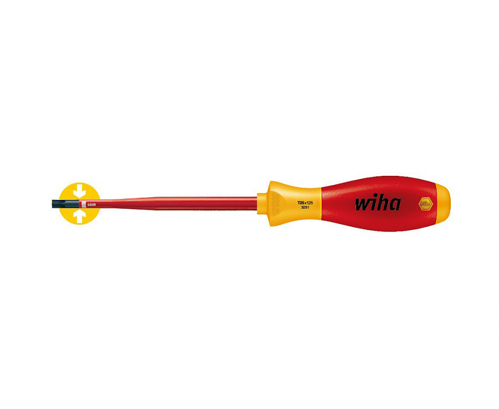 Отвертка-звездочка Wiha SoftFinish electric slimFix 3251 T40x150 36542 - диэлектрическая отвертка TORX с тонким жалом из высококачественной хром-ванадий-молибденовой стали. Защитное изоляционное напыление гарантирует безопасность (VDE и GS) при работе с деталями под напряжением до 1000 В. Интегрированная защитная изоляция.