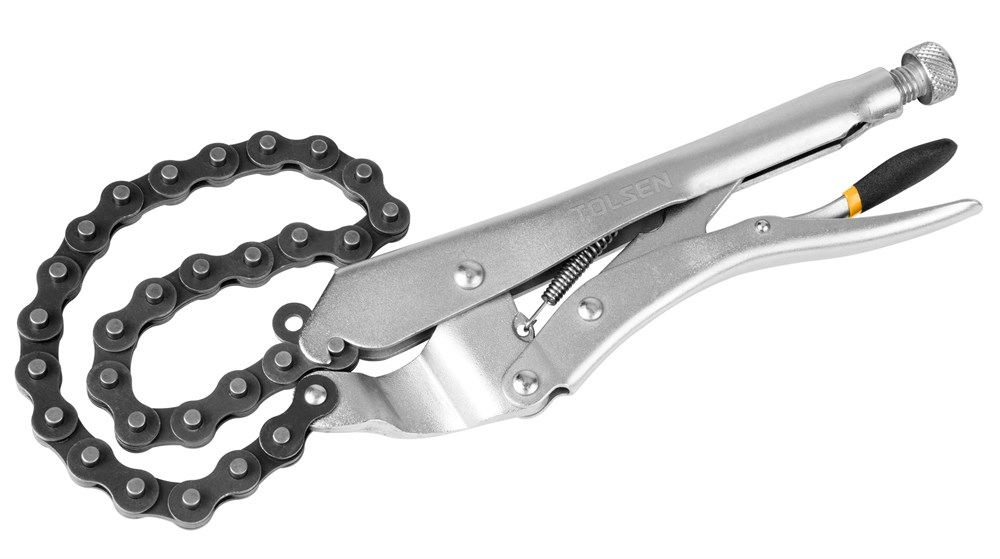 Диаметр захвата – 60-140 мм Длина цепи – 460 мм Длина зажима с фиксатором – 230 мм Применение – профессиональное Материалы – инструментальная сталь, никель, оксидированное покрытие, обливной ПВХ