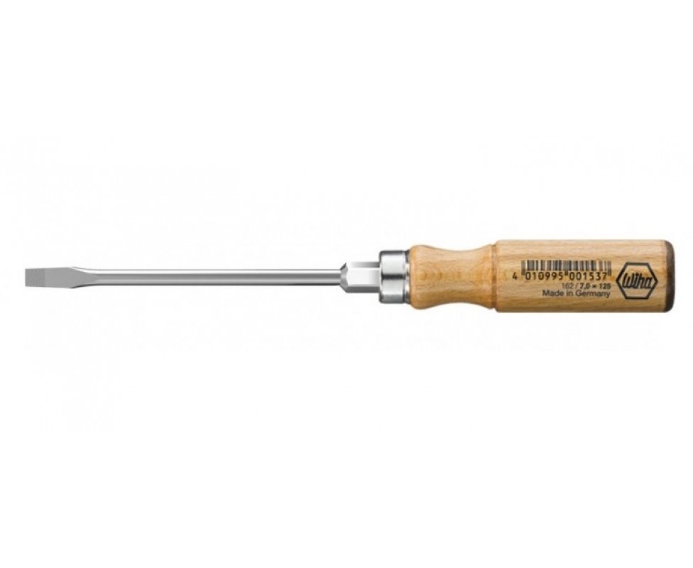Столярная шлицевая отвертка Wiha 162 SL 12,0x200 00157 с профилем прямой шлиц из хромванадиевой стали и рукояткой из бука отлично подходит для повседневных работ в различных средах. Торец ручки защищен высококачественной кожаной крышкой. Используется в повседневных работах в промышленности и мастерских.